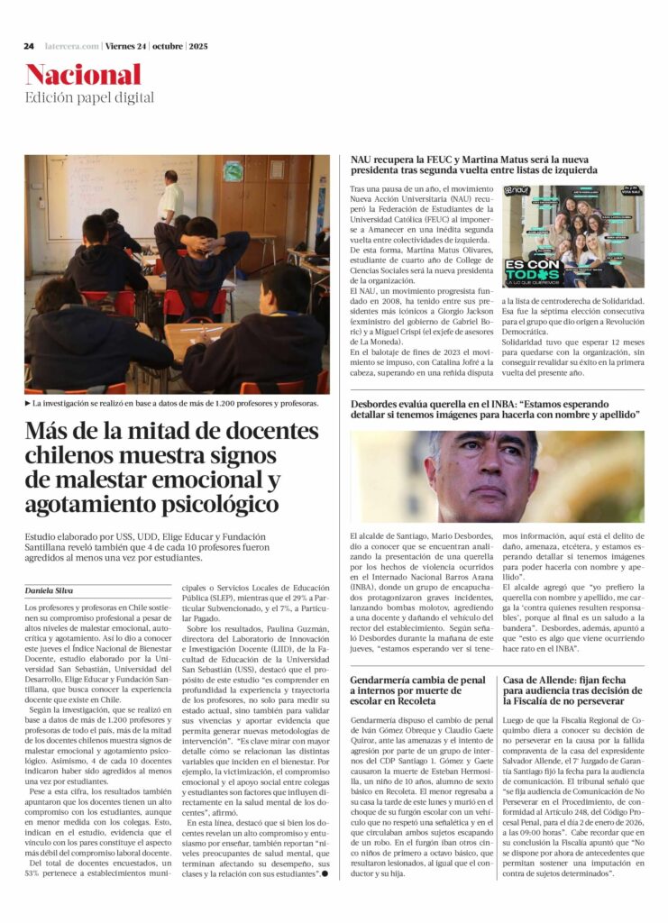 Según la investigación, que se realizó en base a datos de más de 1.200 profesores y profesoras de todo el país, más de la mitad de los docentes chilenos muestra signos de malestar emocional y agotamiento psicológico. Asimismo, 4 de cada 10 docentes indicaron haber sido agredidos al menos una vez por estudiantes.